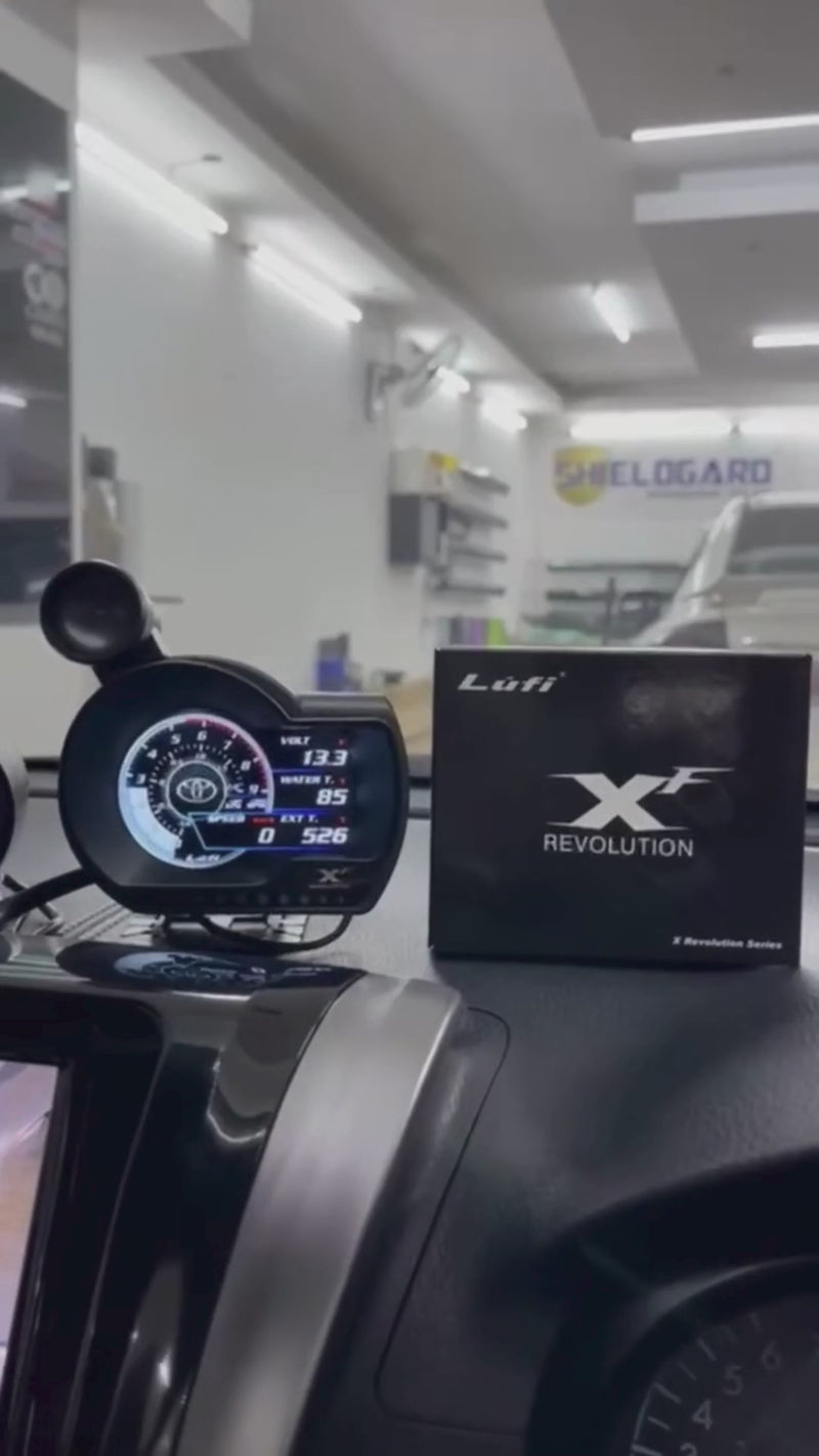 El LUFI XF Revolution es una pantalla digital compacta de alto contraste diseñada para la monitorización en tiempo real de parámetros del vehículo a través del puerto OBD2. Proporciona lecturas precisas de velocidad, RPM, voltaje, temperatura del motor y otros datos disponibles según la ECU del vehículo.